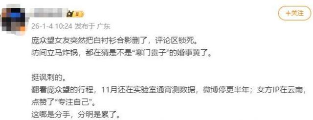 就连话术,都跟明星八卦的爆料一模一样。 说来说去,两人分手这事成了板上钉钉,分手的原因更是层出不穷。 有的说是家庭背景不一样,三观合不来,有的说是他一直钻在实验室里,女朋友等的累了。